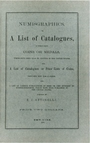 ATTINELLI, Emmanuel J. NUMISGRAPHICS, OR A LIST OF CATALOGUES IN WHICH OCCUR COINS OR MEDALS WHICH HAVE BEEN SOLD BY AUCTION IN THE UNITED STATES. ALSO A LIST OF CATALOGUES OR PRICE LIST OF COINS ISSUED BY DEALERS. ALSO A LIST OF VARIOUS PUBLICATIONS OF MORE OR LESS INTEREST TO NUMISMATOLOGISTS WHICH HAVE PUBLISHED IN THE UNITED STATES, COMPILED BE E. J. ATTINELLI. PRICE, TWO DOLLARS.